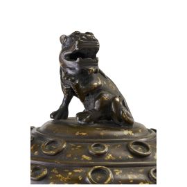 I manici a testa di elefante simboleggiano forza, saggezza e buona sorte, mentre le fasce in rilievo, finemente decorate con motivi floreali e geometrici, contribuiscono all’equilibrio e all’elaborata eleganza del design. Il coperchio è sormontato da un leone di stile "foo dog" finemente fuso, emblema tradizionale di protezione, che riflette la funzione simbolica e possibilmente cerimoniale del vaso.