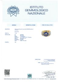 in oro giallo e bianco 18kt, impreziosito al centro da uno zaffiro ceylon taglio ovale di ct 9.50 circa, affiancato da diamanti taglio brillante per ct 0.70 circa, punzone 750, mis. 18/58, gr. 17. Corredato di certificato IGN del 28/03/2025 attestante l'origine geografica dello zaffiro e l'assenza di trattamenti termici.