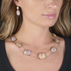 in oro a basso titolo, collana composta da dieci cammei su conchiglia raffiguranti scene mitologiche, collegati tra loro da due catene a filo ritorto, lungh. cm 41; un paio di orecchini pendenti lunghi cm 3,5, con cammei raffiguranti rispettivamente Euterpe (musa greca della musica) e Tersicore (musa protettrice della danza); accompagnati da una fibbia composta da cammei su conchiglia raffiguranti il soggetto mitologico del "Carro dell'aurora", dim. cm 9x2 circa, gr. 35 complessivi. Corredata di scatola recante la scritta "Ricordo di Antonio Canova a C.F. 1814" e di lettera risalente al 1879 dell'allora proprietaria, scritta all'attenzione della nobile signora Malvina Frank di Stadler.
