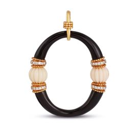 in oro giallo 18kt, composta da paio di orecchini a clip (difetti) e grande pendente in onice e boules in corallo con scanalature, impreziosita da diamanti taglio huit huit per ct 1.80 circa, firmata "Boucheron", punzoni francesi, 750, marchio del fabbricante e numero seriale, dim. orecchini cm 1,5x3,5 circa, dim. pendente cm 5,5x7,5, gr. 69 complessivi