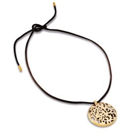 composta da nastro in tessuto e pendente circolare in oro giallo 18kt, con elementi in onice e pietra semipreziosa al centro, disposti in modo da rappresentare il muso di un leopardo, firmata "Cartier", punzone 750 e n. seriale, diam. pendente cm 3,5x4 circa, lungh. cm 64, gr. 16. Corredata di scatola.