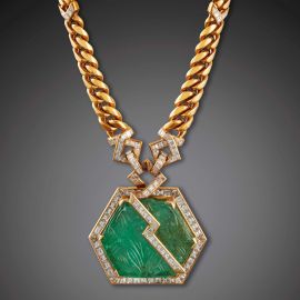 in oro giallo 18kt, composta da catena a maglia groumette e pendente di cm 4x4,5, con grande smeraldo centrale inciso e diamanti taglio carré e baguette per ct 6 circa, firmata "Faraone", punzone 750, lungh. cm 41, gr. 99. Corredata di astuccio.