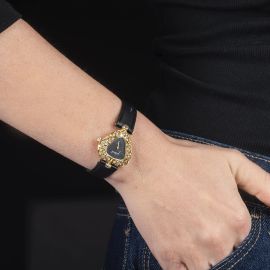 cassa a forma di cuore in oro giallo 18kt, quadrante nero firmato "Gio Caroli", ghiera impreziosita da diamanti taglio brillante per ct 1 circa, corona con diamante, movimento a carica manuale, cinturino in pelle, fibbia in oro giallo, lungh. cm 19. Dim. mm 25x25