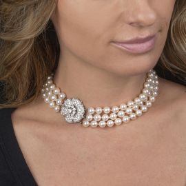 realizzata a tre fili di perle di mm 8 circa, fermatura in oro bianco 18kt a forma di fiore e impreziosita da un diamante centrale taglio brillante di ct 0.70 circa, circondato da diamanti taglio brillante per ct 3.60 circa, corredato di fermatura aggiuntiva in oro giallo 18kt con quarzo citrino taglio ovale e diamanti taglio brillante, punzone 750, lungh. cm 38, gr. 101