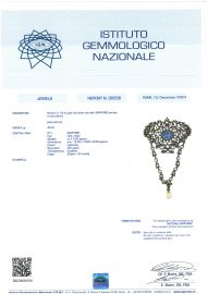 in oro e argento, impreziosita da rose di diamante e uno zaffiro ceylon centrale taglio ovale di ct 11 circa, con parte pendente a cui si collega un ciondolo con perla di mm 8 circa, dim. cm 6x10, gr. 40. Corredata di certificato IGN del 12/12/2024 attestante l'origine geografica dello zaffiro e l'assenza di trattamenti termici.