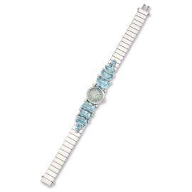 cassa in oro bianco 18kt, quadrante argenté con indici applicati, bracciale integrato in oro bianco 18kt con acquamarine taglio fantasia e diamanti taglio brillante per ct 0.30 circa, firmato "Lacloche Frères Paris" con n. seriale, movimento a carica manuale (non funzionante), lungh. cm 17, gr. 52