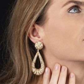 in oro giallo 18kt, impreziositi da pavé di diamanti taglio brillante per ct 10 circa, dim. cm 3x7,5, gr. 49 complessivi