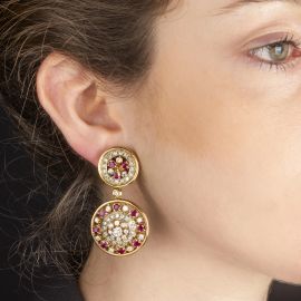 in oro giallo e bianco 18kt, a forma di dischi sovrapposti, impreziositi da rubini taglio a goccia e rotondo per ct 2 circa, chiusura a clip con perno, 2,5x5, gr. 38 complessivi