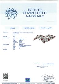 in oro bianco 18kt, impreziosita da rubini (africa orientale) taglio ottagonale per ct 5 circa, e da diamanti taglio brillante, baguette e tapes per ct 8 circa, punzone 750, dim. cm 6,5x2,5, gr. 20. Corredata di certificato IGN del 15/01/2025 attestante le caratteristiche e l'assenza di trattamenti termici.