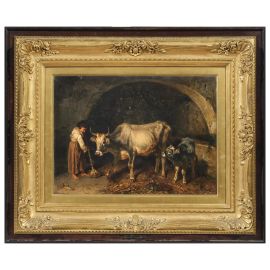 A PEASANT WOMAN WITH OXEN IN THE STABLE