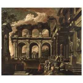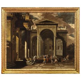 Nel corso della sua attività artistica, Viviano Codazzi (1604 - 1670) ha collaborato con diversi artisti. In particolare, durante il suo soggiorno napoletano verso il 1621, iniziò una cooperazione serrata con Domenico Gargiulo (1612- 1675), noto anche come Micco Spadaro. I due si specializzarono in generi distinti ma complementari: il primo nell'architettura, il secondo nella pittura di figura. Questa collaborazione diede vita a una vasta produzione di dipinti raffiguranti vedute di città, capricci architettonici e scene religiose. La prima opera eseguita in collaborazione è Le rovine del tempio del 1621 circa, un olio su tela conservato al Walters Art Museum di Baltimora. Per corroborare l'attribuzione a Codazzi e a Micco Spadaro, la nostra opera può essere confrontata con il dipinto raffigurante la Strage degli Innocenti conservato presso la Collezione d'Arte della Banca d'Italia: l'architettura mostra chiaramente la cifra stilistica del primo, mentre la stesura veloce ma molto accurata e la ricca espressività gestuale che lega in modo armonico i gruppi di figure allo spazio sono caratteristiche della maestria del secondo.