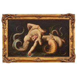 L'opera presenta affinità stilistiche e inventive con la coppia di dipinti con Combattimenti tra tritoni e grifi del fiemmese Cristoforo Unterperger (Cavalese, 1732 - Roma, 1798), realizzati nel corso del settimo-ottavo decennio del Settecento e conservati nella Pinacoteca Civica Fortunato Duranti di Montefortino.