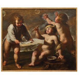 La tela presenta una raffigurazione piuttosto rara. Si tratta di tre putti che giocano con le bolle di sapone. Una tale iconografia è riconosciuta come un’allegoria della vanità, in quanto la bolla era simbolo dell'effimero ed era allusiva della vacuità della vita. Una suddetta interpretazione si evince nel dittico latino di Marco Terenzio Varrone: “quod, ut dicitur, si est home bulle, eo magis senex” (De Rustica, 1,1-7). Il poeta accosta l’uomo ad una bolla di sapone, come avvenne anche, in senso moralistico, in epoca rinascimentale con Erasmo da Rotterdam e poi, successivamente, nell’ambiente romano che ruotava intorno a Cassiano del Pozzo nella prima metà del Seicento. Ed è proprio in questo momento che fioriscono immagini di putti intenti a soffiare per creare bolle di sapone, ma il caso qui presentato è davvero unico. L’opera è stata pubblicata da Anna Orlando come Giovanni Battista Carlone (1603-1683/1684), uno dei pittori più importanti tra quelli attivi a Genova nel Seicento. Per la studiosa si tratta di un’opera da datarsi intorno al 1640 circa, ovvero subito a ridosso del suo soggiorno milanese avvenuto nei primi anni Trenta, in stretto rapporto con il Sacrificio di Isacco già Koelliker e un San Gerolamo di collezione privata. Infatti, nella tela qui presentata “il naturalismo domina sulla componente barocca che prenderà l’avvento qualche anno dopo, con il recupero, soprattutto, del chiassoso colorismo di matrice rubensiana” (Orlando 2019, p. 252).