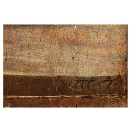 Per quanto riguarda la datazione frammentaria in basso, ci sono pochi dubbi che si debba leggere come 14..7, ma prima del '7' non è facile capire quale numero ci sia. Si intravede una linea nera bombata che fa sospettare in un 6 o in un 8.