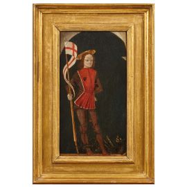 L'inedita tavola mostra un elegante San Giorgio con la mano sinistra appoggiata al fianco e la destra che trattiene il suo vessillo, mentre ai suoi piedi guizza un drago sotto un'arcata in pietra scorciata dal basso. Sul retro la tavola è dipinta: si vede distintamente il 'serafico crocifisso' e i cinque raggi di luce; questi sono diretti alle mani, ai piedi e al costato di san Francesco, non visibile.