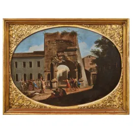 La tela di formato ovale presenta il Martirio di san Sebastiano ambientato presso l'Arco di Tito. Tale scenografia è presente anche in altri dipinti dello stesso Niccolò Codazzi, tra cui quello conservato al Musée des Beaux-Arts di Bordeaux (inv. E 261), quello di collezione privata di Coral Gables (Florida) e il Capriccio del Musée des Beaux-Arts di Béziers (no. 252). In questi tre casi le figure sono state dipinte da collaboratori fiamminghi o olandesi (Jacob de Heusch, Theodor Helmbreker), mentre nel caso qui analizzato sembra si tratti di un pittore francese o di un artista molto vicino a Filippo Lauri.