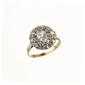 composta da catena in oro giallo 18kt e pendente in oro e argento, il ciondolo reca al centro una miniatura, lungh. cm 39, dim. pendente cm 3x5,5; accompagnata da un anello in oro e argento, impreziosito da rose di diamante e un diamante centrale taglio vecchio di ct 0.30 circa, mis. 14/54, gr. 15 complessivi