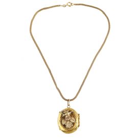 composta da una catena tubolare in oro giallo 18kt di gr. 11 circa, e un ciondolo portafoto (difetti) in oro a basso titolo con scena floreale di gr. 8, lungh. cm 41, dim. pendente cm 3x5, gr. 19 complessivi
