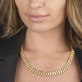 in oro giallo e bianco satinato 18kt, composta da una serie concatenata di maglie a mezzaluna, di cui alcune impreziosite da pavé di diamanti taglio brillante (uno mancante) per ct 1.50 circa, punzoni 750 e del fabbricante, lungh. cm 49, gr. 52