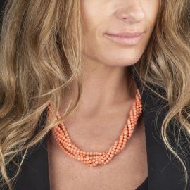 realizzata a sei fili di sfere in corallo rosa di mm 4 circa, fermatura in oro giallo 18kt, punzone 750, lungh. cm 54, gr. 102