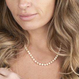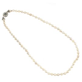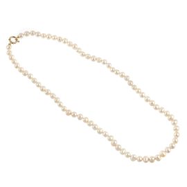 di cui una realizzata ad un filo di perle di mm 5 circa, fermatura in oro bianco 18kt con zaffiro taglio rotondo (difetti), punzone 750, lungh. cm 46, accompagnata da una seconda collana ad un filo di perle di mm 7 circa, fermatura in oro 14kt, lungh. cm 52, gr. 59 complessivi