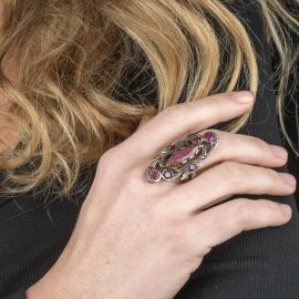 BIG NAVETTE RUBY RING AND EMERALD BROOCH IN GOLD AND METAL