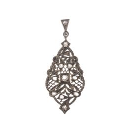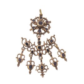 composto da una collana in oro giallo 18kt, lungh. cm 52,5, gr. 6; accompagnata da un pendente in oro 9kt, con elementi pendenti impreziositi da granati (difetti), dim. cm 3x6, con secondo pendente in oro 9kt, lavorato a traforo, impreziosito da rose di diamante, dim. cm 2x5, gr. 13 complessivi