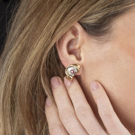 in oro giallo, bianco e rosa 18kt, impreziositi da due rubini taglio ovale per ct 0.30 circa e diamanti taglio brillante, chiusura a clip con perno, punzoni 750 e del fabbricante, dim. cm 1,5x2,5 circa, gr. 13 complessivi