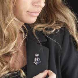 in oro a basso titolo, decorata in smalto, raffigurante una croce al centro di una stella, simbolo dell'ordine, ed il motto "Honi soit qui mal y pense" (fr.: "Sia svergognato colui che pensa male"), impreziosita da diamanti taglio vecchio, dim. cm 2x3,5, gr. 6