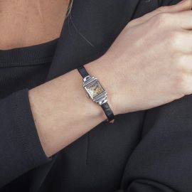 cassa di forma in acciaio staybrite, fondello a pressione, anse a scomparsa, quadrante argentè (difetti) ristampato, numeri romani, movimento a carica manuale cal 407 n.130307, cinturino in pelle nera con fibbia in acciaio non originali, vetro minerale. Dim. mm 14x23
