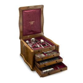 Composizione: 12 forchette, 12 cucchiai, 12 coltelli, 12 forchette da pesce, 12 coltelli da pesce, 12 cucchiai da frutta, 12 coltelli da frutta, 12 forchette da frutta,12 palette da gelato,12 cucchiaini da tè, 11 posate da portata, 5 piccole posate da servizio