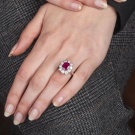 in oro bianco 18kt, impreziosito al centro da un rubino taglio ovale di ct 1.70 circa, circondato da diamanti taglio brillante per ct 1.50 circa, punzoni 750 e del fabbricante, mis. 14/54, gr. 5