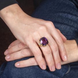 BIG AMETHYST AND DIAMOND RING IN 18KT YELLOW GOLD