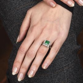 in oro bianco 18kt, impreziosito al centro da uno smeraldo taglio ottagonale di ct 1.80 circa, circondato da una fila di diamanti taglio brillante per ct 0.80 circa, mis. 14/54, gr. 7