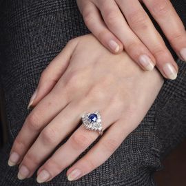 in oro bianco 18kt, impreziosito al centro da uno zaffiro taglio ovale di ct 2 circa, circondato da diamanti taglio a goccia per ct 0.40 circa e da diamanti taglio baguette per ct 2 circa, punzone 18kt, mis. 15/55, gr. 5