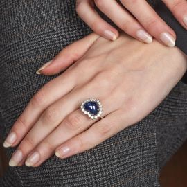 in oro bianco 18kt, impreziosito al centro da uno zaffiro taglio cabochon a forma di cuore di ct 7 circa, circondato da diamanti taglio brillante per ct 0.90 circa, punzone 750, mis. 15/55, gr. 8