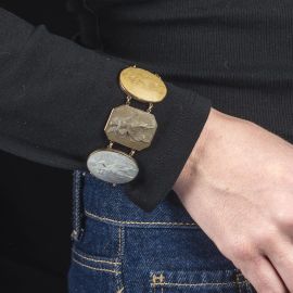 in oro 9kt, composto da una serie di maglie formate da placche in pietra lavica incisa, chiusura in oro giallo 18kt, lungh. cm 17,5, gr. 32