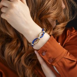 in oro giallo e bianco 18kt, realizzato a doppia fascia di cui una decorata in smalto blu, impreziosito da diamanti taglio brillante per ct 1 circa, punzoni 750 e del fabbricante, lungh. cm 18, gr. 45