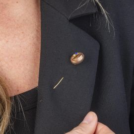 una in oro giallo 14kt, con un minerale sormontato da una perla di mm 5 circa, dim. cm 2,5x3,5, gr. 11; accompagnata da una spilla da giacca in oro 9kt, lungh. cm 7, gr. 1,9