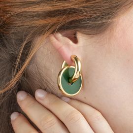 in oro giallo 18kt, da cui pendono due dischi in calcedonio verde, punzoni 750 e del fabbricante, dim. cm 2,5x3,5, gr. 20 complessivi