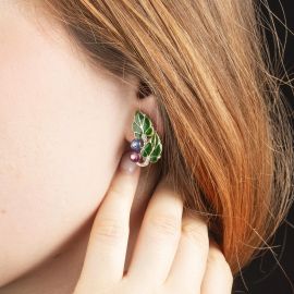 in oro bianco e giallo 18kt, foglie decorate in smalto verde, impreziositi da sfere di zaffiri e rubini (difetti), e da diamanti taglio brillante, chiusura a clip con perno, punzoni 750 e del fabbricante, dim. cm 1,5x2,5, gr. 16 complessivi