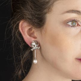 in oro 9kt e oro 18kt, realizzati a forma di fiocco, impreziositi da rose di diamante e perle di mm 8 e 7 circa, chiusura a clip, dim. cm 2x4, gr. 14 complessivi