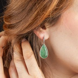 in oro bianco 18kt, impreziositi da due smeraldi taglio a goccia per ct 10 circa e da diamanti taglio brillante per ct 0.25 circa, chiusura a farfallina, punzone 750, lungh. cm 1,5x4, gr. 8 complessivi