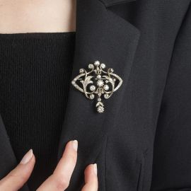 in oro 14kt, realizzata a forma di tralci, impreziosita da diamanti taglio vecchio per ct 3.90 circa, dim. cm 5x5, gr. 13
