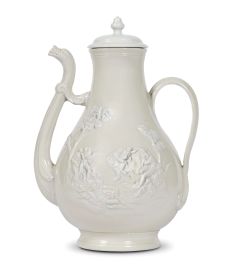 in porcellana bianca con decoro a bassorilievo istoriato con scene mitologiche; corpo di forma ovoidale con beccuccio zoomorfo, ansa semplice e coperchio con pomolo a ghianda. Il decoro a bassorilievo istoriato, ispirato alle Metamorfosi di Ovidio, è tratto dalle placchette cinquecentesche, di cui si conservano le formelle originali in bronzo nel Museo delle porcellane di Doccia; alt. cm 27,5x19x15,4