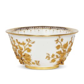 in porcellana a pasta dura di forma emisferica con bordo svasato e basso piede ad anello. La superficie mostra una decorazione dorata a rilievo con un elegante motivo a tralci di uva che si allargano a partire dal tronco della vite. La doratura detta “goldspitzendekor” all’interno dell’orlo arricchisce l’ornato. Opere di porcellana sottili con decoro a rilievo furono create in manifattura da Johan Friedrich Böttger tra il 1713 e il 1725, e a tal proposito si veda il vaso con tralci di uva; alt. cm 8,4, diam. cm 16,8
