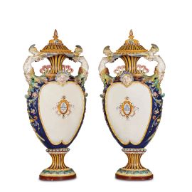 COPPIA DI GRANDI VASI STEMMATI, FAENZA, MANIFATTURA FARINA, 1885