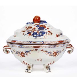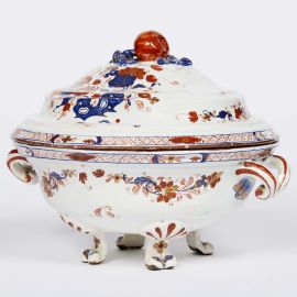 in maiolica dipinta in policromia, corpo di forma circolare poggiante su quattro piedini a ricciolo, doppia presa laterale a staffa che termina in un ricciolo, orlo fortemente estroflesso; coperchio alto con scanalature, centrato da una presa a frutto. Il decoro, di ispirazione orientale, riproduce i canoni stilistici della porcellana Imari con tocchi di oro; cm 25,8x32x29,2