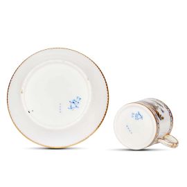 in porcellana dura dipinta in policroma e oro, tazza a litron decorata con una scena di paesaggio con natura morta, piattino circolare con una scena di porto, entrambe i pezzi bordati da fasce con decoro continuo blu e oro. Sul fondo marca anomala della manifattura Vincenne con lettere bb in blu associate a puntini; tazzina alt. cm 4,8, piattino diam. cm 11,2
