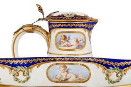in porcellana dipinta in policromia e oro. La forma, come da consuetudine, si basa su esempi francesi coevi di argenteria: il bacile è ovale con tesa alta e orlo sagomato, e il versatoio piriforme ha imboccatura piana chiusa da un coperchio montato in argento. Il decoro, coerente tra i due esemplari, vede raffigurati putti all’interno di riserve ovali circondate da eleganti corone floreali che si alternano a cesti di piccoli fioretti in campo blu. Sul fondo del bacile lettera B dipinta in blu di cobalto ed etichetta di provenienza SILVIA GIUSTI – ANTIQUARIATO – MILANO; versatoio alt. cm 17,5, bacile cm 5,5x25,2x18,2
